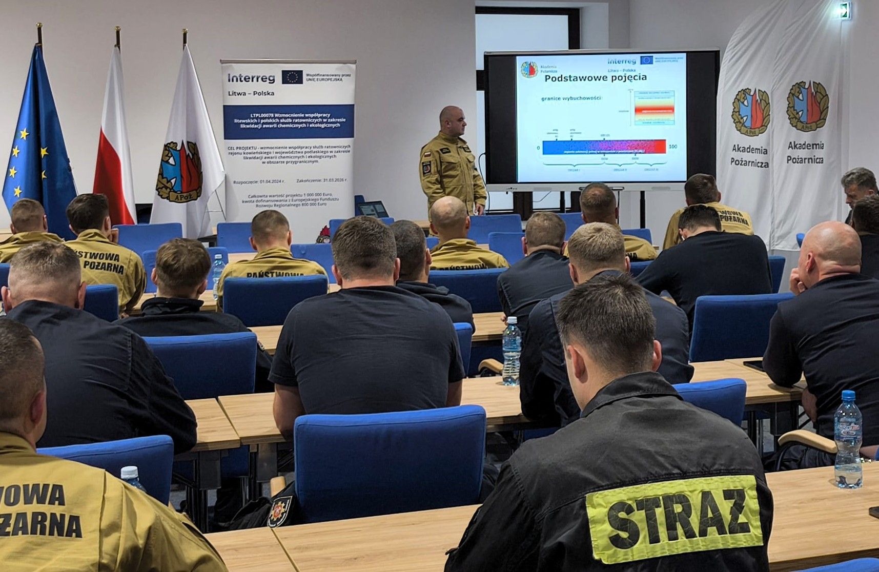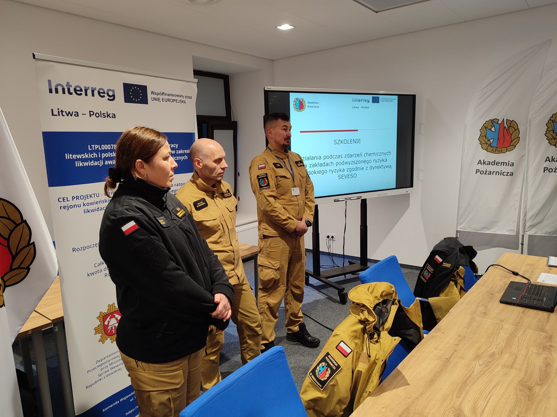 W dniach 24-25 listopada br. w Bazie Doskonalenia Zawodowego i Poligonu Akademii Pożarniczej w Nowym Dworze Mazowieckim odbyło się ostatnie szkolenie realizowane na zlecenie Komendy Wojewódzkiej Państwowej Straży Pożarnej w Białymstoku w ramach projektu „Wzmocnienie współpracy litewskich i polskich służb ratowniczych w zakresie likwidacji awarii chemicznych i ekologicznych” współfinansowanego przez Unię Europejską ze środków programu INTERREG. Szkolenie „Działania podczas zdarzeń chemicznych w zakładach podwyższonego i wysokiego ryzyka zgodnie z dyrektywą SEVESO” przeprowadzone zostało według programu zatwierdzonego przez Komendanta Wojewódzkiego PSP w Białymstoku zawierającego następujące tematy: