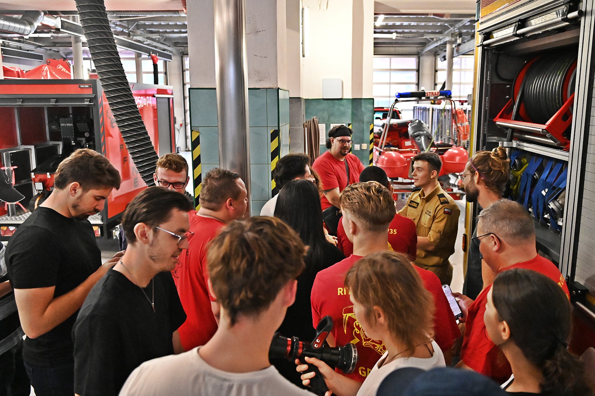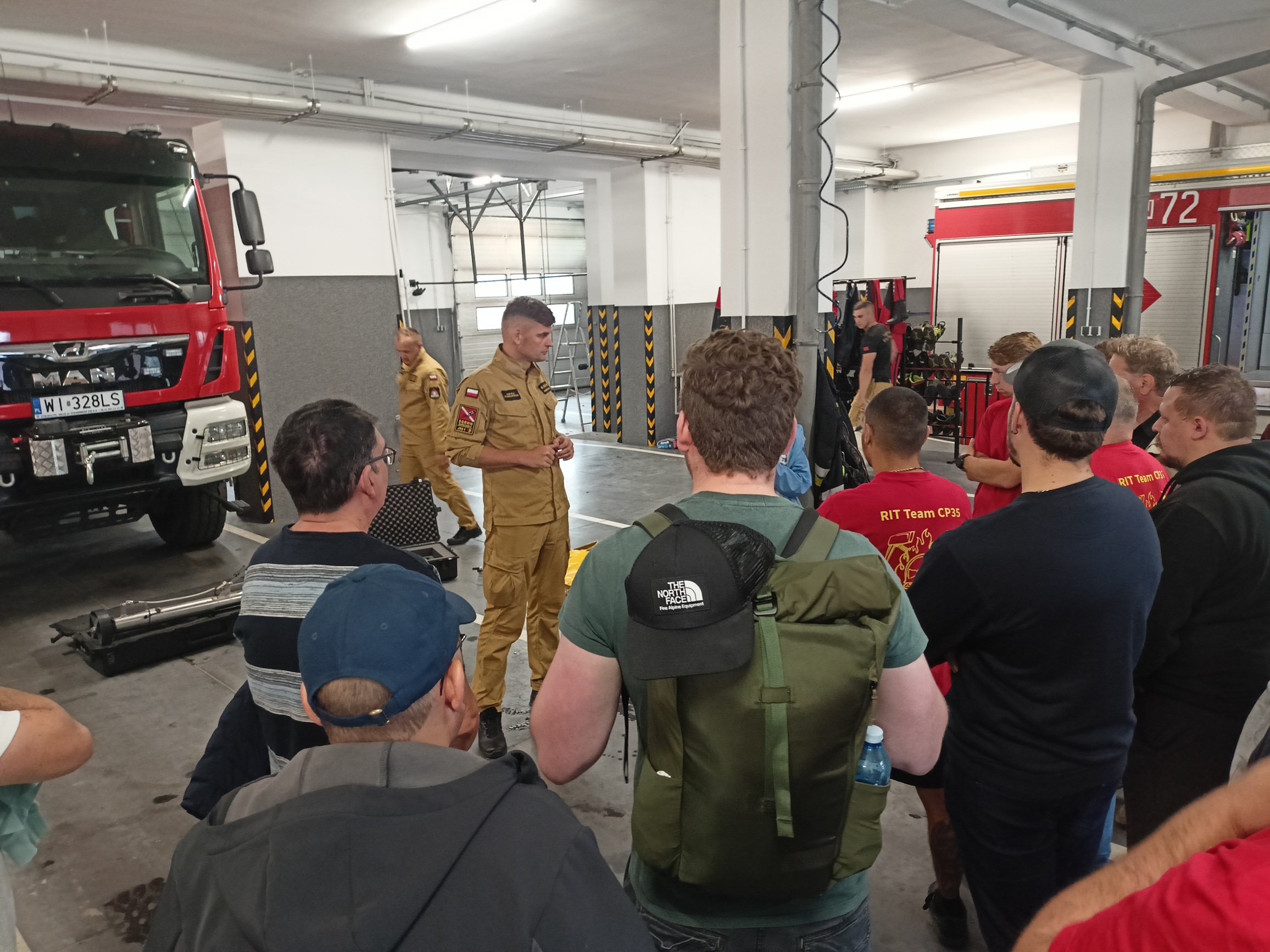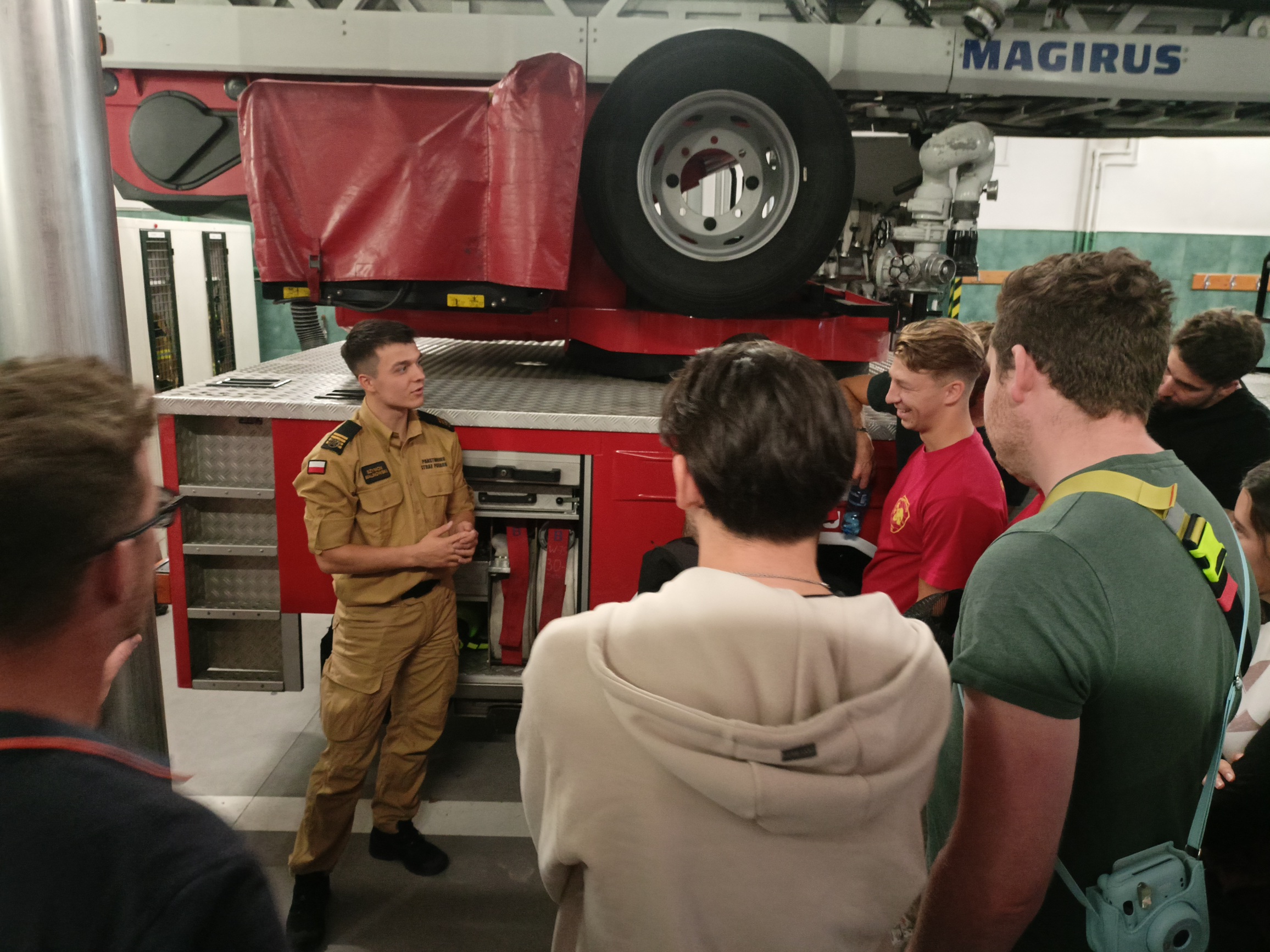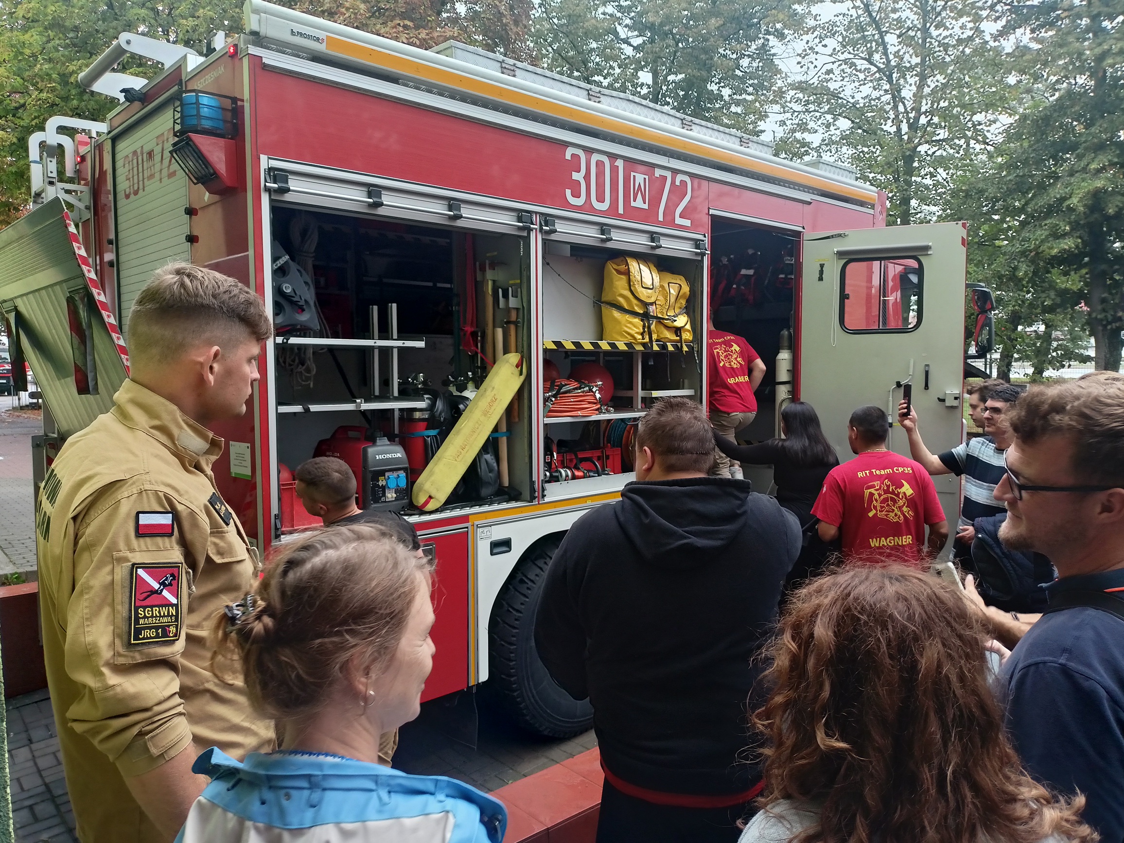W dalszej części wizyty grupa odwiedziła Jednostkę Ratowniczo-Gaśniczą Akademii Pożarniczej, gdzie z dużym zainteresowaniem obejrzała wyposażenie oraz specjalistyczne pojazdy wykorzystywane przez polskich strażaków w ich codziennej pracy. Goście zapoznali się również z funkcjonowaniem jednostki, w której służbę pełnią także podchorążowie Akademii, zdobywając praktyczne doświadczenie i przygotowując się do przyszłej kariery w Państwowej Straży Pożarnej.
