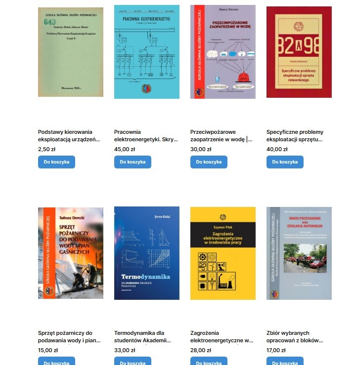 W eKsięgarni APoż dostępne są podręczniki i skrypty przydatne podczas studiów, jak również monografie i publikacje okolicznościowe. Zachęcamy do zapoznania się z nowościami wydawniczymi i bestsellerami, wśród których znajdują się „Problematyka projektowania i modelowania procesu eksploatacji wybranych urządzeń przeciwpożarowych”, „Potencjał bezzałogowych statków powietrznych w działaniach ratowniczych”, „Wytyczne weryfikacji instalacji wentylacji strumieniowej garaży zamkniętych za pomocą symulacji CFD”, „Ewakuacja uczestników imprez o charakterze masowym” czy publikacje z zakresu reagowania na pożary lasów (The SILVANUS Handbook on Systematic Methodology for the Preparation and Pre-planning Activities for Wildfire Response, New Technologies in Enhancing Training for Fire Service in Wildfire Response. The SILVANUS approach), jak również publikacje z zakresu ochrony ludności. I wiele, wiele innych.